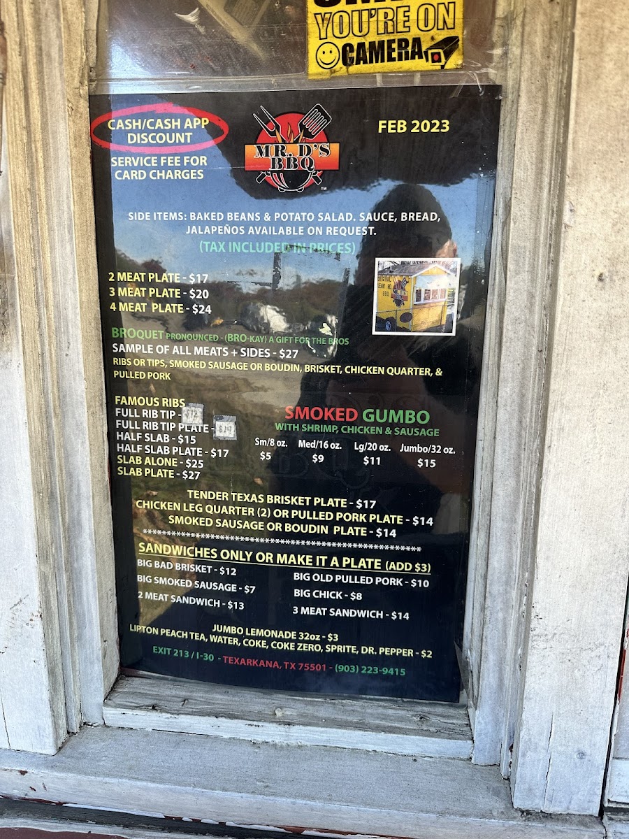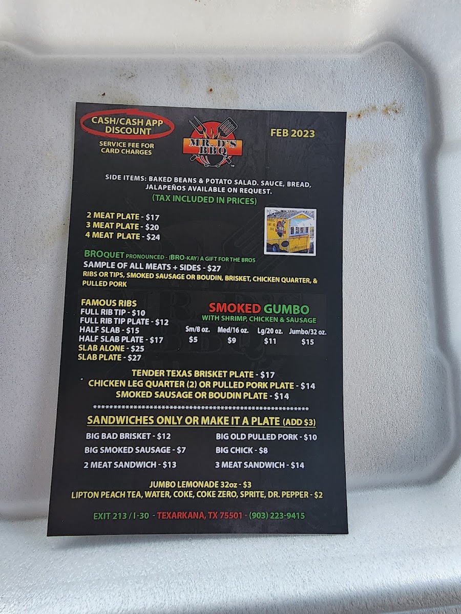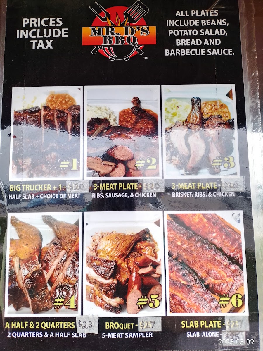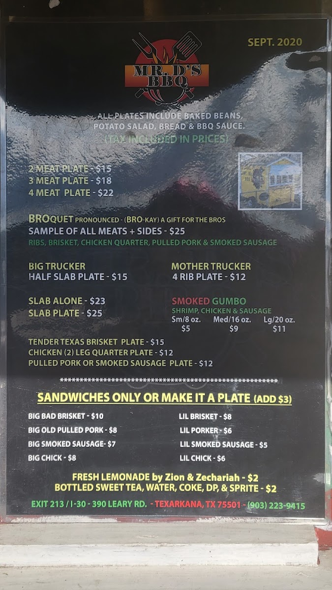 Welcome to Mr. D's BBQ, a culinary gem nestled in Texarkana, TX. Known for its legendary ribs, Mr. D's offers a mouthwatering selection that includes a Half Slab at just $21.70, boasting tender, smoky flavor that keeps patrons coming back for more. For those craving variety, the Three Meat Plate allows you to sample brisket, boudin sausage, and their standout smoked gumbo, which is a crowd favorite, available in sizes from 8 oz to 32 oz.